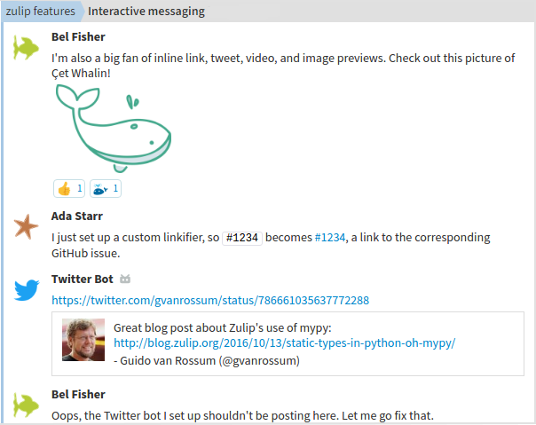 • Zulip has by far the most active open-source development community of any team chat software. The paid team provides leadership, expertise and support for the project in addition to operating the Zulip Cloud service.